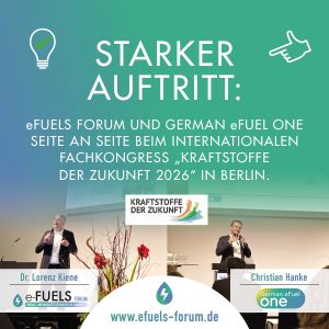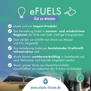 eFuels („Electricity-based Fuels“) sind flüssige synthetische Kraft- und Brennstoffe, die mittels grünen Stroms aus Wasserstoff und Kohlenstoffdioxid hergestellt werden. Da bei ihrer Nutzung nur so viel CO2 freigesetzt wird, wie zuvor bei ihrer Produktion der Atmosphäre entnommen wurde, tragen sie im Vergleich zu herkömmlichen fossilen Brennstoffen zu einer ausgeglichenen CO2-Bilanz bei.