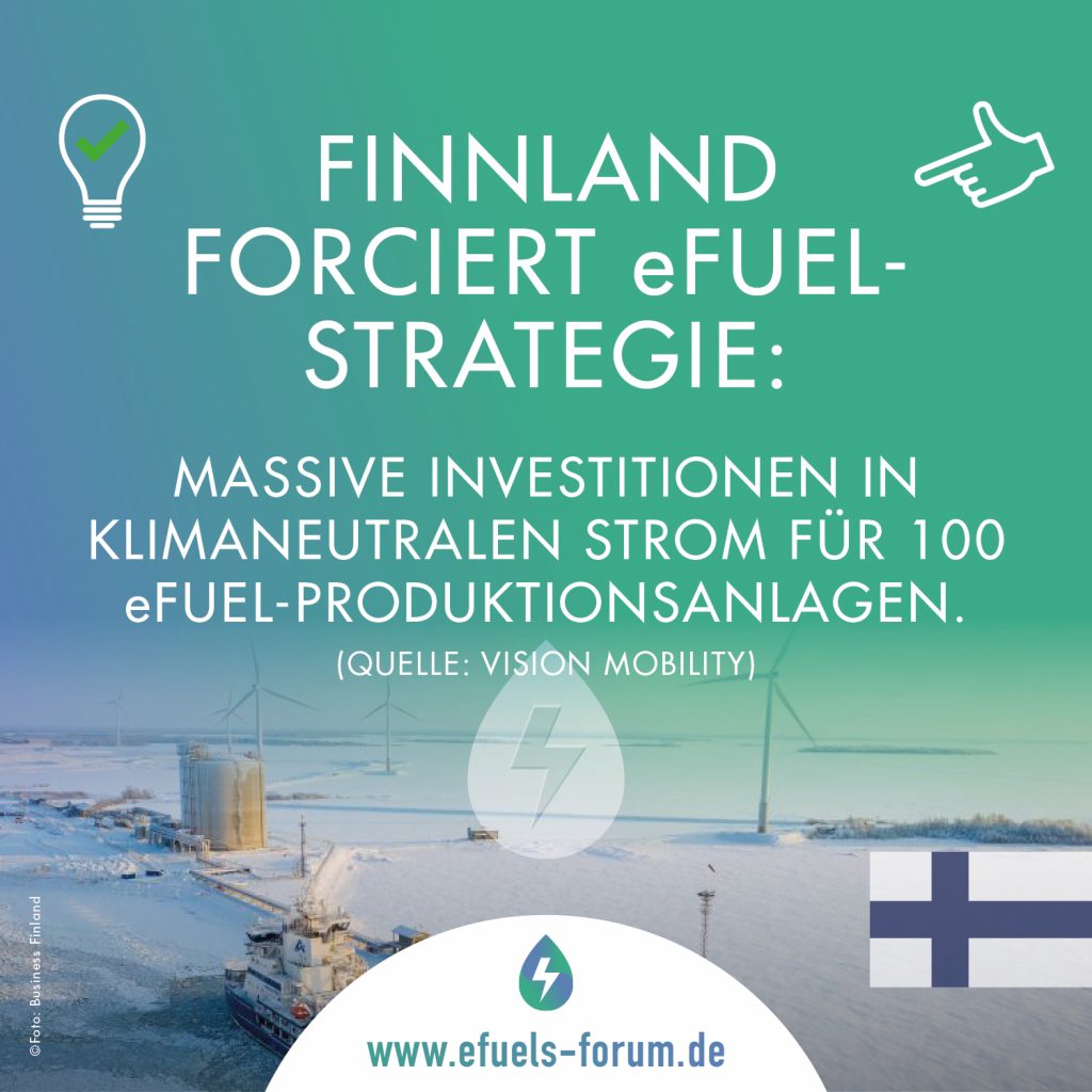 Und weiter: Das Fundament der finnischen Strategie ist eine geplante Steigerung der CO2-neutralen Stromerzeugung um 70 Prozent bis 2030 auf dann 140 Terawattstunden (TWh). Neben dem Ausbau der erneuerbaren Energien – die Onshore-Windkraft-Planung beläuft sich auf mehr als 60.000 Megawatt Peak (MWp) und die Solarenergie auf mehr als 26.000 MWp – verfügt Finnland über weitere Standortvorteile. Die Strompreise gehören zu den niedrigsten in Europa, was die energieintensive Herstellung von eFuels wirtschaftlich attraktiv macht. Zudem verfügt das Land über reichlich biogenes CO2 aus Nebenströmen seiner nachhaltig bewirtschafteten Forstindustrie, die sowieso anfallen und als Rohstoff für die Synthese von eFuels dienen kann.